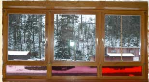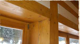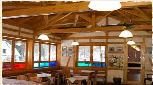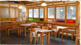 Společenská místnost v patře je otevřená do krovu. Aby se zlepšily akumulační schopnosti, jsou hrázděné stěny vyplněné vyzdívkou z plných cihel a omítnuty.